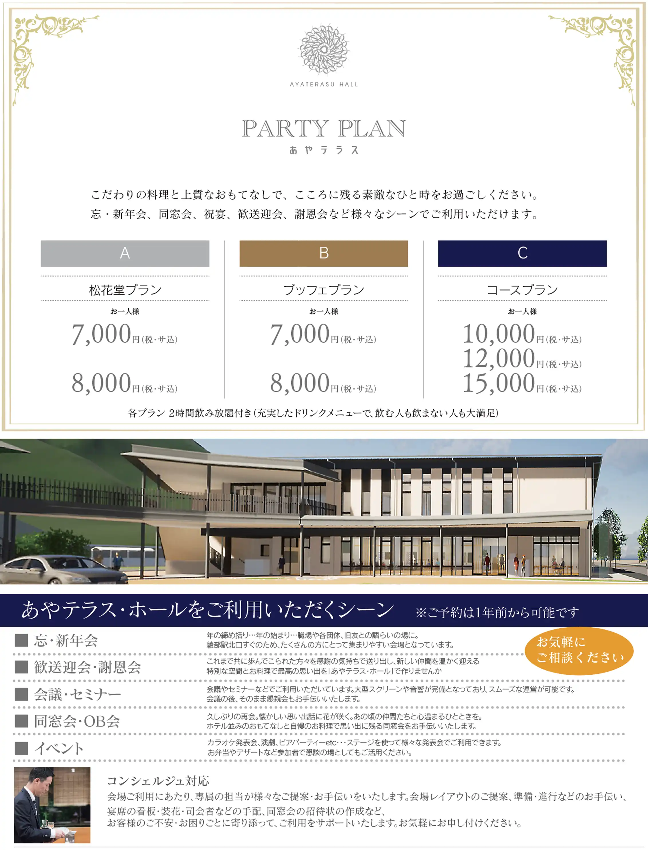 会場設営費を、ご宴席の前後1時間ずつ会場費として頂戴いたします。